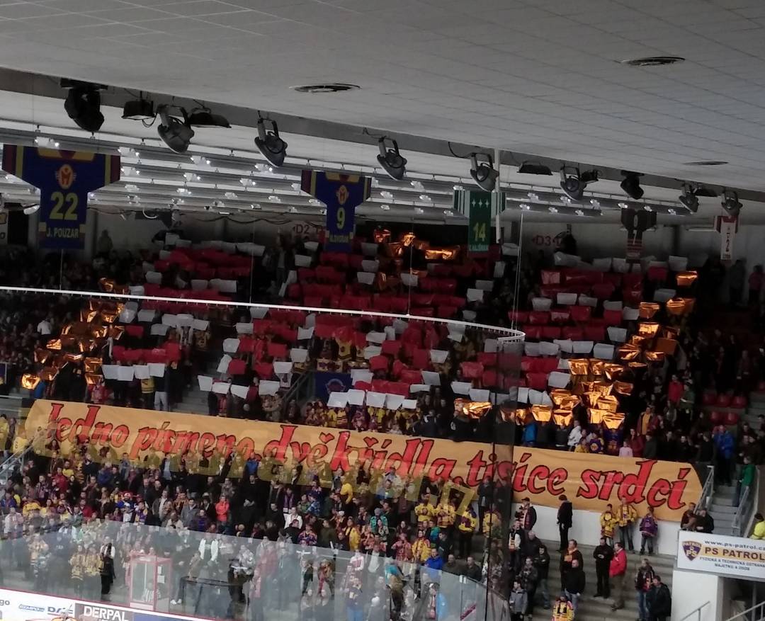 Sleduji fandění ale i dění na ledě a třeba podotknout, že bída, která se dnes odehrává na ledě se přenáší na domácí fanoušky. Jsem z toho fakt otrávený. O další přestávce skouknu choreo, které je bohužel rozhodně z těch horších. Kartoniáda, která znázorňuje znak klubu a nějaké zlaté fólie kolem, jakoby zlatý transparent na němž stojí „Jedno písmeno, dvě křídla, tisíce srdcí“. Nebyla to jediná prezentace, která byla v plánu, ještě jsme objednali interiérovou pyrotechniku avšak bohužel, v hale se momentálně nedá zhasnout a bez toho to má téměř nulový efekt, myslím si, že i kdyby jsme měli v plánu je použít, udělali bychom to i po kdejaké prohře, ale po té dnešní ne. Jo a abych nezapoměl, v kotli proběhla sbírka na mávačky, která vynesla téměř 7 a půl tisíce, což je super, vlajky sou už objednané a do play off by měly být ready. Díky všem co přispěli!